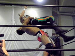 諸橋コーナーに振って突っ込む、サムライカウンターのキックから飛びつきDDT(左写真)、カウント2。