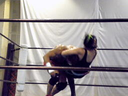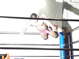 コーナーに上ってダイビングヘッドバット(右写真)、カウント2。