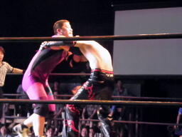 イサミドロップキックで先制、矢野かわして首を取る(右写真)。