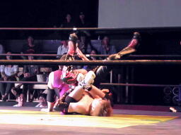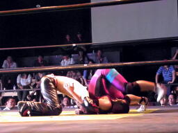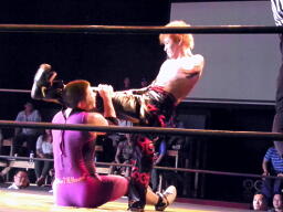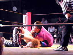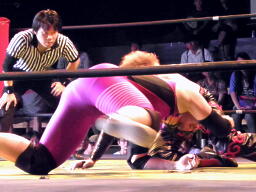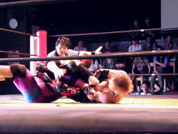 矢野は啓ちゃんボンバー、イサミキャッチしてワキ固めに(左写真)、軍鶏を狙うが矢野はブロック。