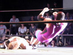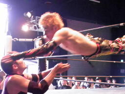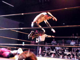 イサミダイビングダブルニードロップ、矢野かわす(右写真)。