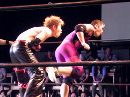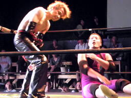 コーナーに上ってミサイルキック(右写真)、カウント2。