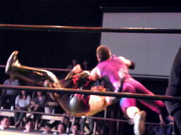 座り込んで下から掌底(右写真)、イサミすぐさま顔面ドロップキック。矢野場外エスケープ。