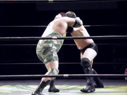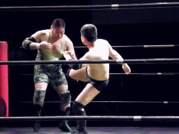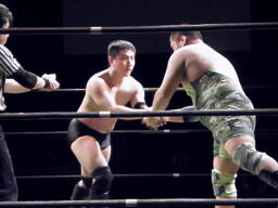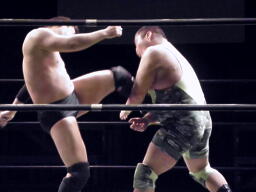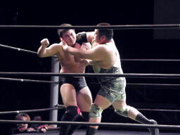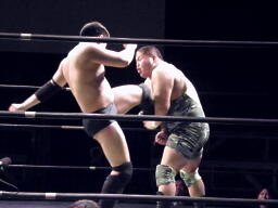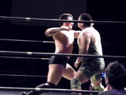 妻木立ち上がってエルボー(左写真)、入江もエルボー返し張り手、カウント2。