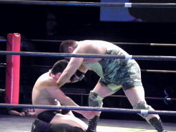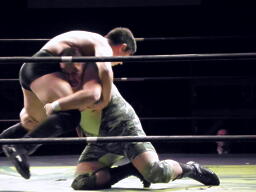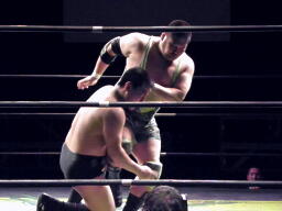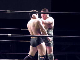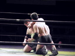 ロックアップ(右写真)、入江腕取ってハンマーロックからヘッドロック。