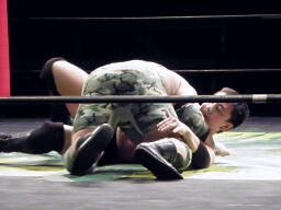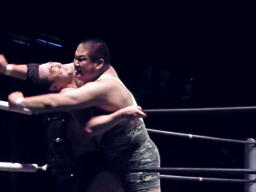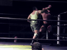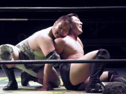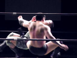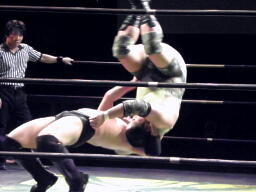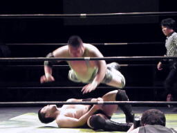 ボディスラムからジャンピングボディプレス(左写真)、カウント2。
