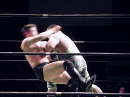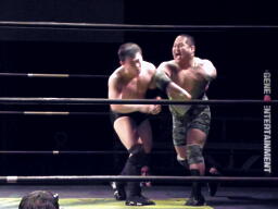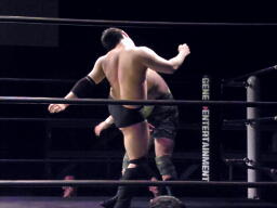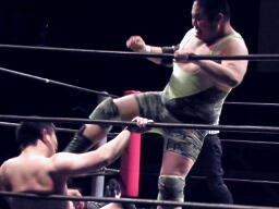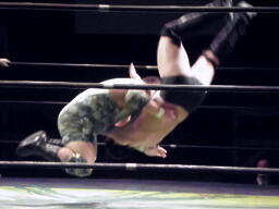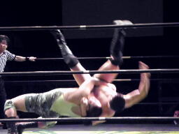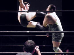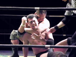 妻木ソバット(右写真)、ロープに飛んでショルダーブロック、入江を倒す。