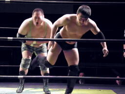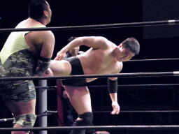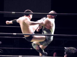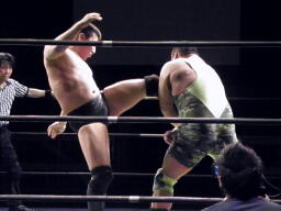 入江コーナーに振ってスプラッシュ狙う、妻木かわしてドロップキック(左写真)、倒れないと見るやロープに飛んでもう一発ドロップキック、倒す。