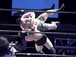 肩に担ぐと垂直落下式(自分が)バックフリップ(右写真)、カウント2。