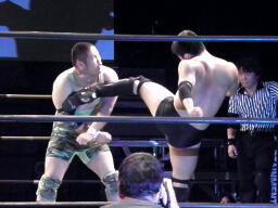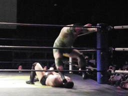 妻木コーナーに上ってダイビングヘッドバット、カウント2。ミドルキック(左写真)、