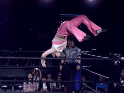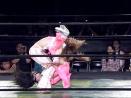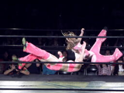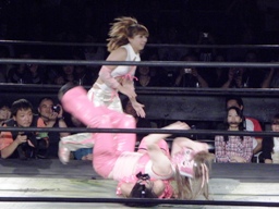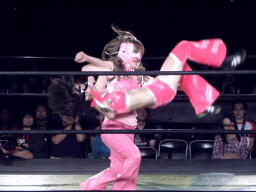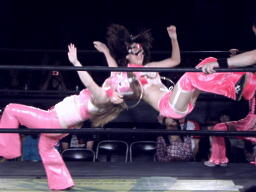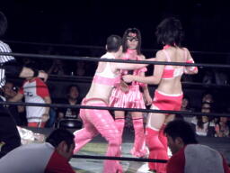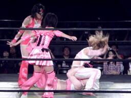 ブラックチェリーズはさくらの腹に攻撃(右写真)、しかしさくらは腹を震わせて2人を飛ばす。チェリーが腹巻を客席に投げ捨てる。