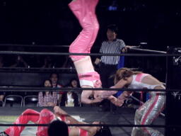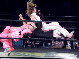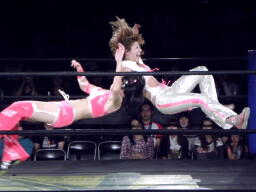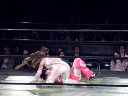 チェリーエビ固め(右写真)、カウント2。ドラゴンスリーパーからリバースDDT、カウント2。