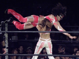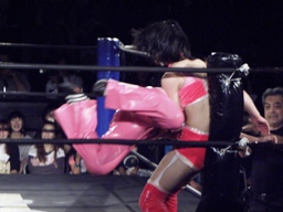 コーナーに上ったさくらをファンタスティックフリップで2号の上に投げ落とす(右写真)。