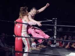 チェリーはトラースキックからコーナーに上ってチェリートーンボム(左写真)、カウント3。