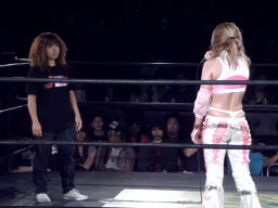チェリー「みなさんに聞いていただきたいことがあります。私はチェリーとしてプロレス7年間やって来まして、今まで結果という結果も残してこれないで、女子プロレスの中心にいるかと言ったら外れてしまってると思います。でも、私もチェリーの可能性を信じたいです。7年間自分から行動したことなんてなかったんですけど、初めて自分から行動を起こしてみたいと思います。今日米山さん、いらっしゃいますよね?リングに上がってもらえますか?」と米山をリングに呼び込んで「米山さんの米山革命を聞いたときに、そこに名乗りを上げたいと思いました。私が女子プロレスの中心に行くためにはまずベルトが必要です!米山さんの持っているJWPのベルトがどうしても欲しいです。挑戦させてください!」と挑戦表明(左写真)。