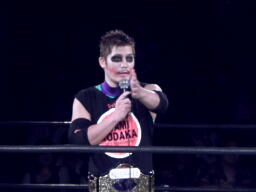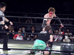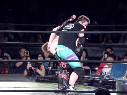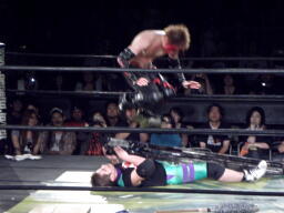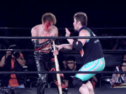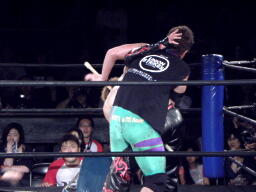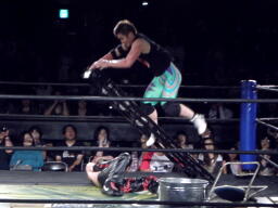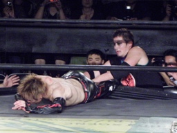 イサミ先に立ち上がると矢野の上にラダーを乗せ、コーナーからダイビングダブルニードロップ(左写真)、カウント2。