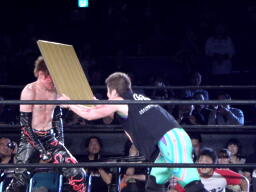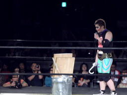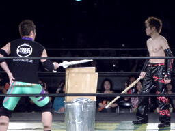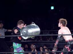 凶器の入ったトラッシュカンをリング中央に置いてカウントダウンで走り込むスクランブルバンクハウスルールを提案(左写真)。イサミ入場後レフェリーが確認し正式にルール変更に。