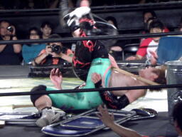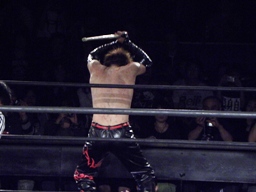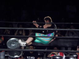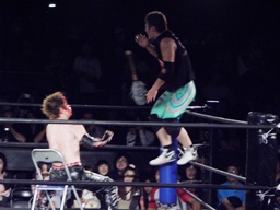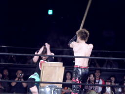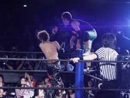 イサミ竹刀持ってトペ・スイシーダ(右写真)。イサミは矢野を客席に投げ込みリングに戻す。
