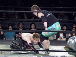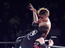 イサミロープに飛ぶ、矢野コブラツイストで捕獲(右写真)。