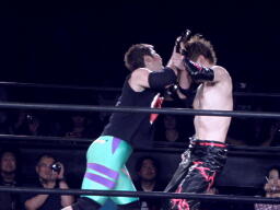 ヨーロピアンアッパーカット(左写真)、イサミもエルボー返す。