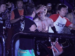 矢野はステージからイサミを突き飛ばしイサミ階段落ち。イサミ大流血(左写真)。