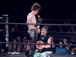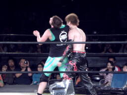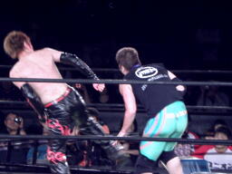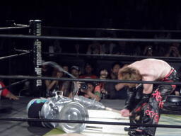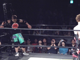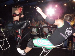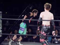 矢野は北側ステージにイスを2つ置き、座っての張り合いを申し出るがイサミは「やるか!」と蹴飛ばす(右写真)。5分経過。