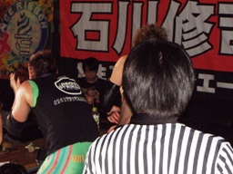 イサミ「矢野、寝ないで自分の興行やって、この後頑固プロレスだって?お前との接点もさっぱりわかんねえけど、俺を好いてるって聞いて、こういう場で試合できて嬉しいよ。」と矢野にビールを渡し(左写真)「なんとかの盃って奴だ」と乾杯。