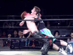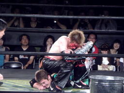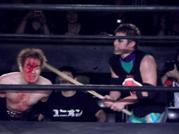 イサミは矢野の啓ちゃんボンバーにカウンターの有刺鉄線バット(右写真)、そして勇脚、カウント3。