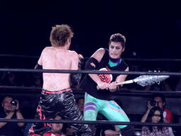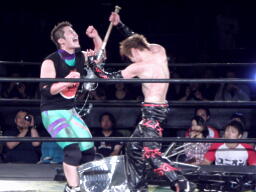 矢野がジョーカーっぽいメイク、イサミTシャツでリングイン、竜に凶器を持って来させる(右写真)。
