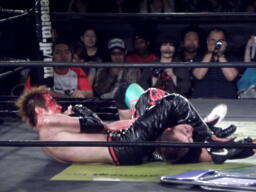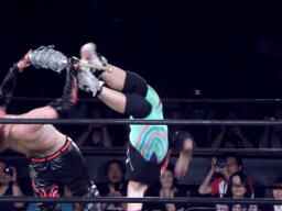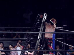 イサミ「もう一度やってみよう」と再度ラダーを立てて振るが今度は矢野とラダーが同時に倒れる(左写真)。カバーはカウント2。