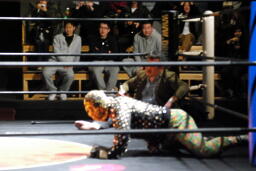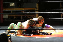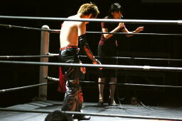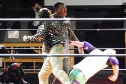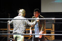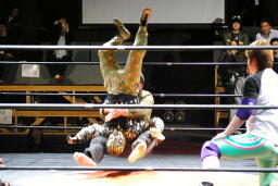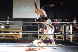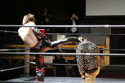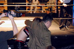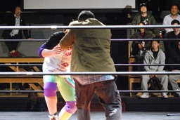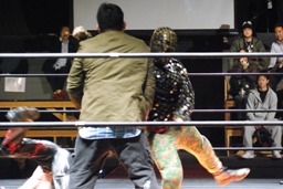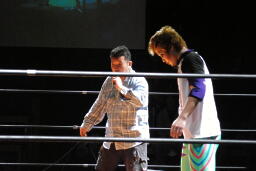 飛田が何かを取りに控室に戻ったのを見てイサミと矢野は銭ゲバラを何度もカバー(右写真)、しかし銭ゲバラはキックアウト。飛田が戻りCG(撮影は不能)。