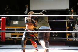 飛田とイサミはロックアップでスタート。飛田ヘッドロック、イサミロープに振る、飛田ショルダーブロック、クロスチョップ(右写真)。