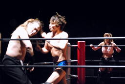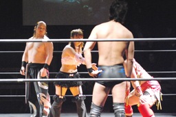 宮崎張り手、ロープに飛んでドロップキック、大家かわしてショルダーブロック(右写真)。チェリーを呼び込む。5分経過。