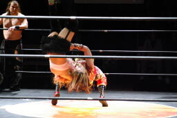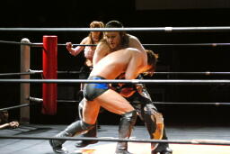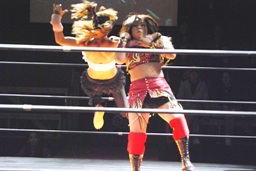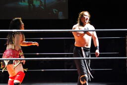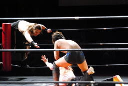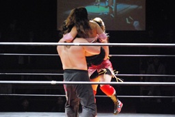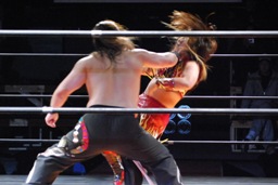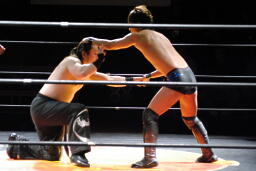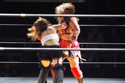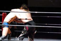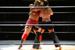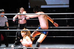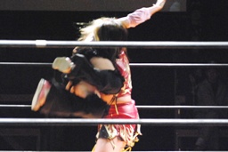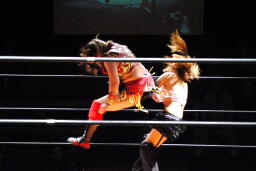 円華タックル(右写真)、バックの取り合い。会場からの大「大家」コールに円華は花道を帰ろうとするが「仕事しろ!」の野次に戻って来る。
