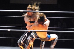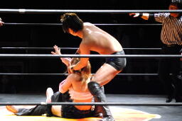 宮崎チョップ、ロープに振る、チェリークロスボディ(左写真)、宮崎キャッチしてスラム、カウント2。