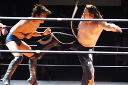 ダブルでロープに振ると大家がチェリーを抱え上げて宮崎にキック(左写真)、