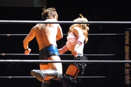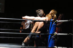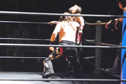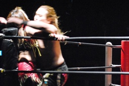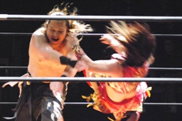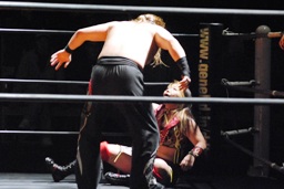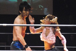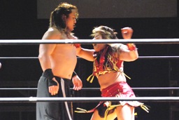 チェリーと宮崎ロックアップ(右写真)、宮崎がロープに押し込む。