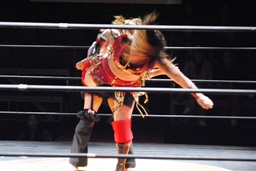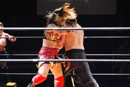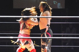 円華コーナーに振って串刺しエルボー(右写真)、宮崎にタッチ。