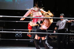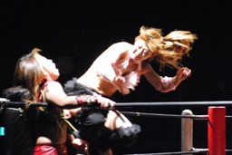宮崎ロープに振る、チェリーはパンチをかわしてフライングネックブリーカードロップ(右写真)。