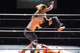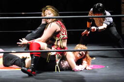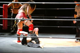 倒れたところにそのまま落としてヒップドロップ(右写真)、チェリーカバー、カウント2。