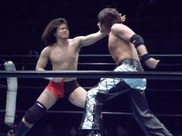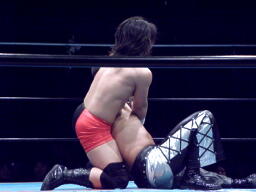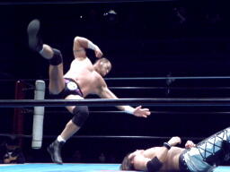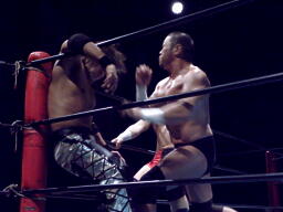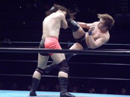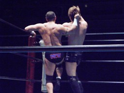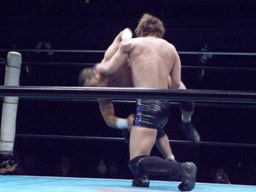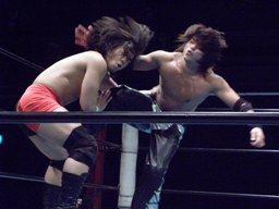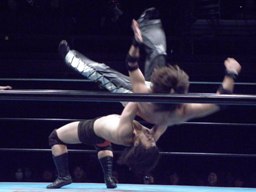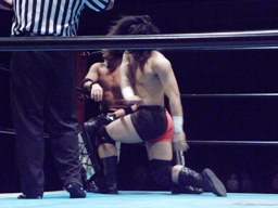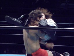 佐々木パンチ、ボディスラム狙うが藤田もブロック、逆にボディスラム。ドロップキックで佐々木場外転落。藤田飛ぶ振りするが飛ばず。佐々木がリングに戻ると藤田ガットショット(右写真)。5分経過。
