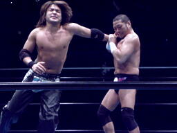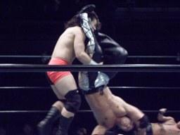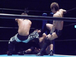 藤田ヘッドロック、佐々木コーナーに押し込んで東郷にタッチ。東郷ロープに振ってドロップキック、カウント2。首投げからフィストドロップ(左写真)、カウント2。
