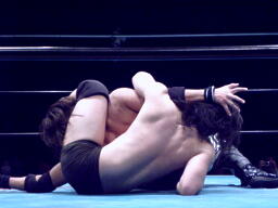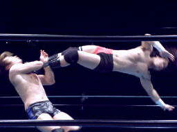 東郷腕をひねる(左写真)、ハンマーロックでグラウンドに持っていくとニースタンプ2発。東郷ヘッドロックからフライングメイヤー、藤田ヘッドシザーズで切り返す。