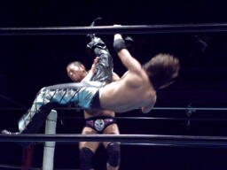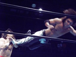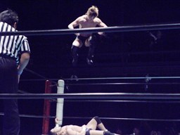佐々木コーナーに振って突っ込む、藤田かわすと「ガッバーナ!」と叫んでスワンダイブミサイルキック(左写真)、カウント2。松井レフェリーぼそっと「違うぞ。」