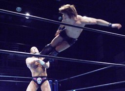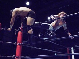 藤田ボディスラム、コーナーに上る。佐々木も上って雪崩式アームホイップ(右写真)。