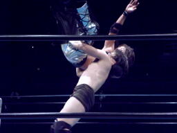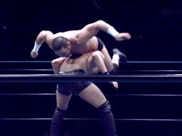 円華は東郷にドロップキック、藤田が「イタリアに帰れボケ!」と叫びながら佐々木をロープに振ってダブルのフラップジャック(右写真)、カウント2。
