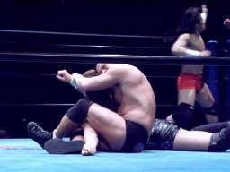 先発は佐々木と藤田。ロックアップ、藤田がロープに押し込む、ブレーク。再度ロックアップ、藤田バック取る、佐々木腕をひねる、藤田切り返す。佐々木エビ固めに、藤田切り返してカバー、カウント1。手四つでリスタート、藤田腕を取るとハンマーロック(右写真)、ヘッドロックに移行。佐々木はカニばさみで倒し首の取り合い、佐々木コーナーに押し込んで東郷にタッチ。