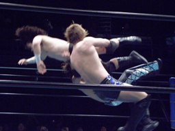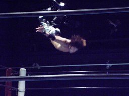 佐々木ボディスラムで投げてコーナーに上る、藤田はドロップキックで場外に落とす(右写真)。
