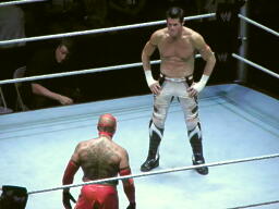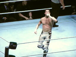 リングに戻ったエヴァンはコーナーのミステリオに突っ込む、ミステリオショルダースルーでかわす(右写真)。