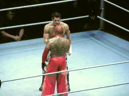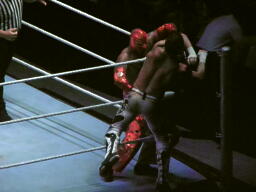 エヴァンはコーナーに飛び乗ってコルバタに(右写真)。カウント2。5分経過。